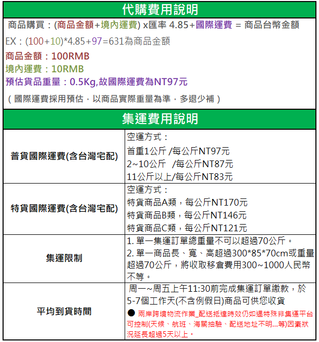 〔100RMB(商品總價)+ 0元(服務費) 〕 × 4.85(匯率)+NT87元 (該重量級距2~10公斤之每公斤金額) × 3 KG +145元(到付/離島寄送)+50元(轉運費 )=941NTD