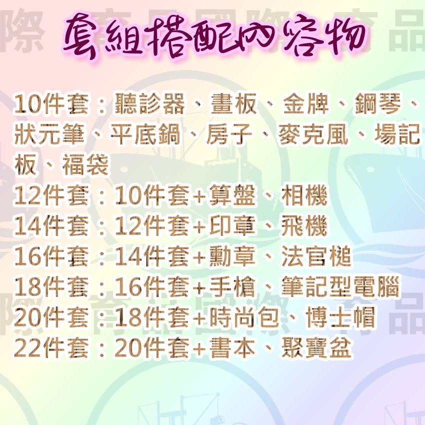 ★☆贈品如下☆★10件.12件.14件.16件.18件.20件.22件.以上7種套組的贈品為相同,贈品內容物有: