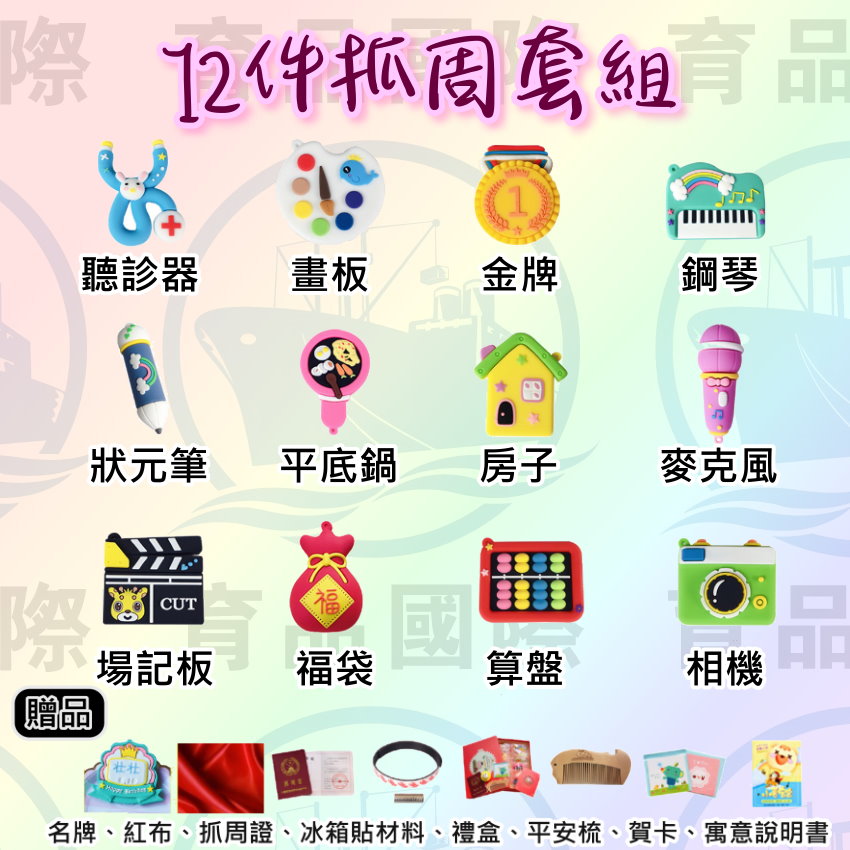 紅布、抓周證、禮盒、冰箱磁貼、平安梳子、賀卡、寓意說明書、吊飾。